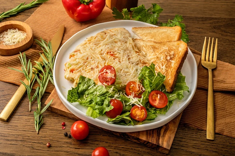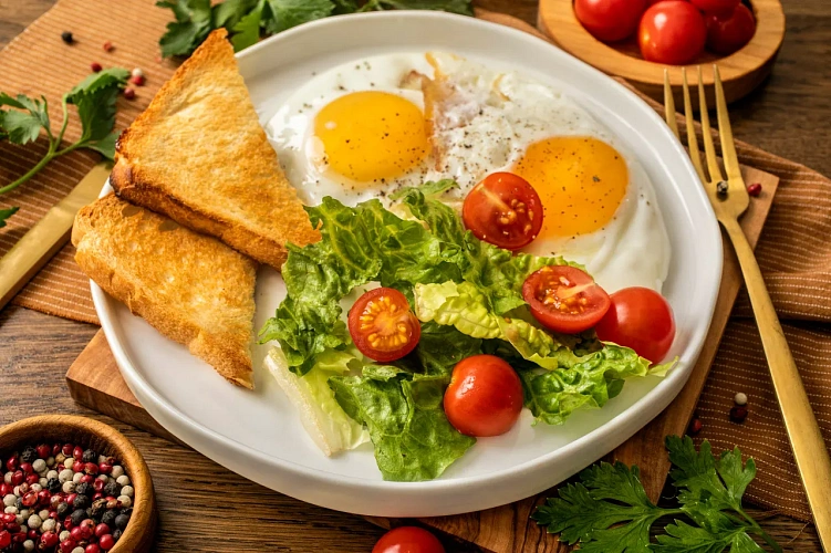 Глазунья из двух яиц, с тостами, листьями салата и томатами черри. Доступно на гриль-барах Амундсена 119, Савкова 21