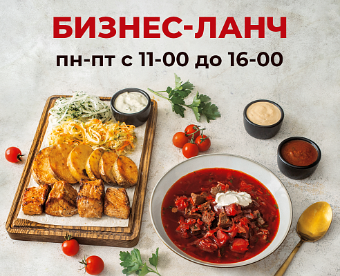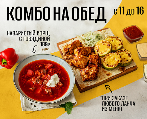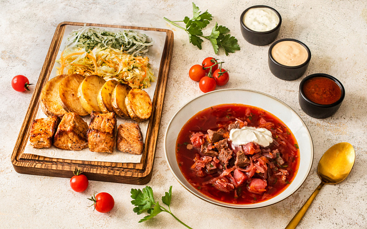 Сытный обед с наваристым борщом, шашлыком из карбонада и картофелем