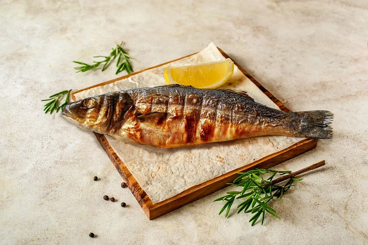 Нежный сибас маринованный в соусе с чесноком и соком лимона. Подаётся с лимоном