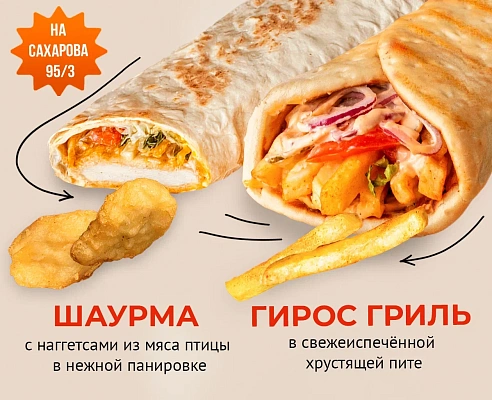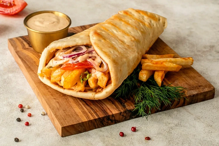 Мягкое мясо курицы, свежие овощи, обжаренный картофель фри и яркий соус Гриль, всё это в свежеиспечённой хрустящей пите