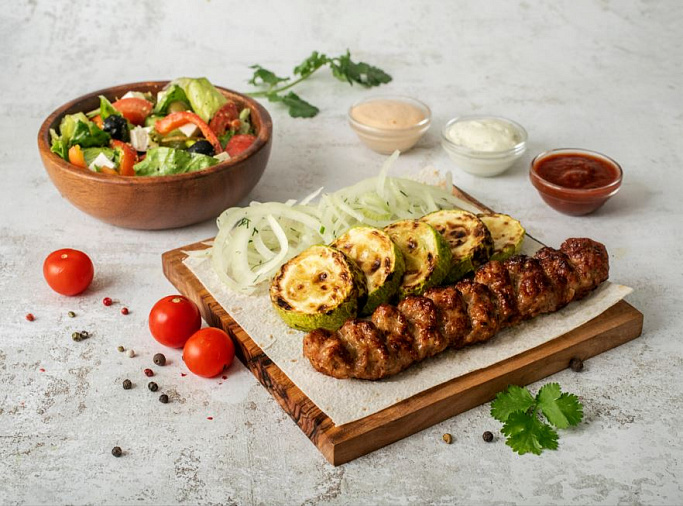 Состав: кебаб из свинины, кабачки на гриле, салат греческий, лук, соус на выбор